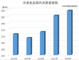 これに冷凍野菜輸入量105万1千938t、調理冷凍食品輸入量25万4千353tを加えた国内消費量は101.3%、289万3千299t。これを日本の総人口で割った国民1人当たりの年間消費量は101.8%、22.9kgといずれも過去最高を記録した。また金額では101.5%、1兆746億円と2年連続で1兆円を超えた。